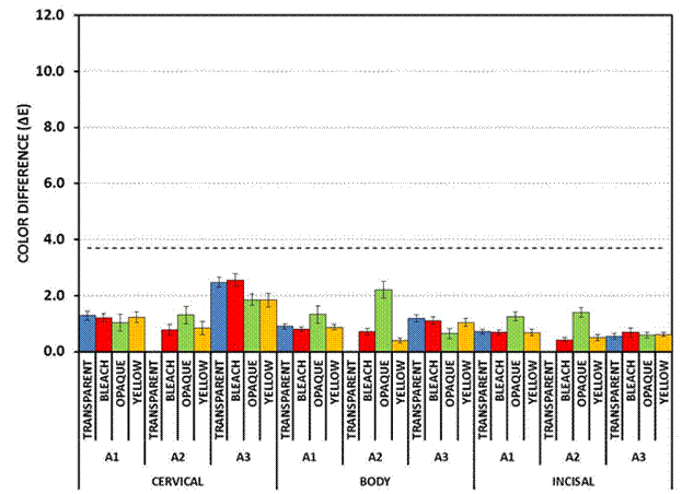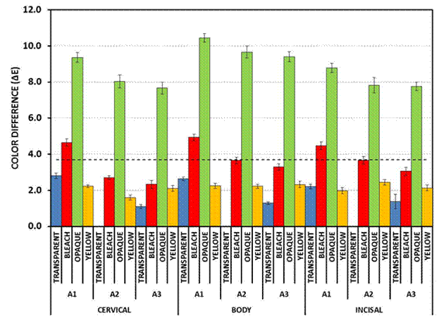 Figure 1: (a) Yttria stabilized zirconia veneers. (b) IPS e.max CAD veneers. (c) Feldspathic porcelain veneers. The color change (ΔE) at the three veneer regions with different composite resin abutments and try in paste colors compared to the control color (composite resin abutment color (A2) and glycerin). The ΔE is illustrated by a horizontal dotted line at 3.7. |