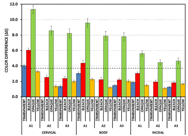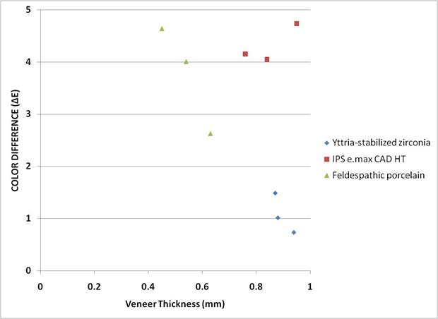 Figure 2: The effect of laminate veneer thickness from cervical region to incisal region on the color difference for yttria stabilized zirconia, IPS e. max CAD, and feldspathic porcelain materials. |