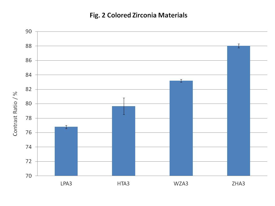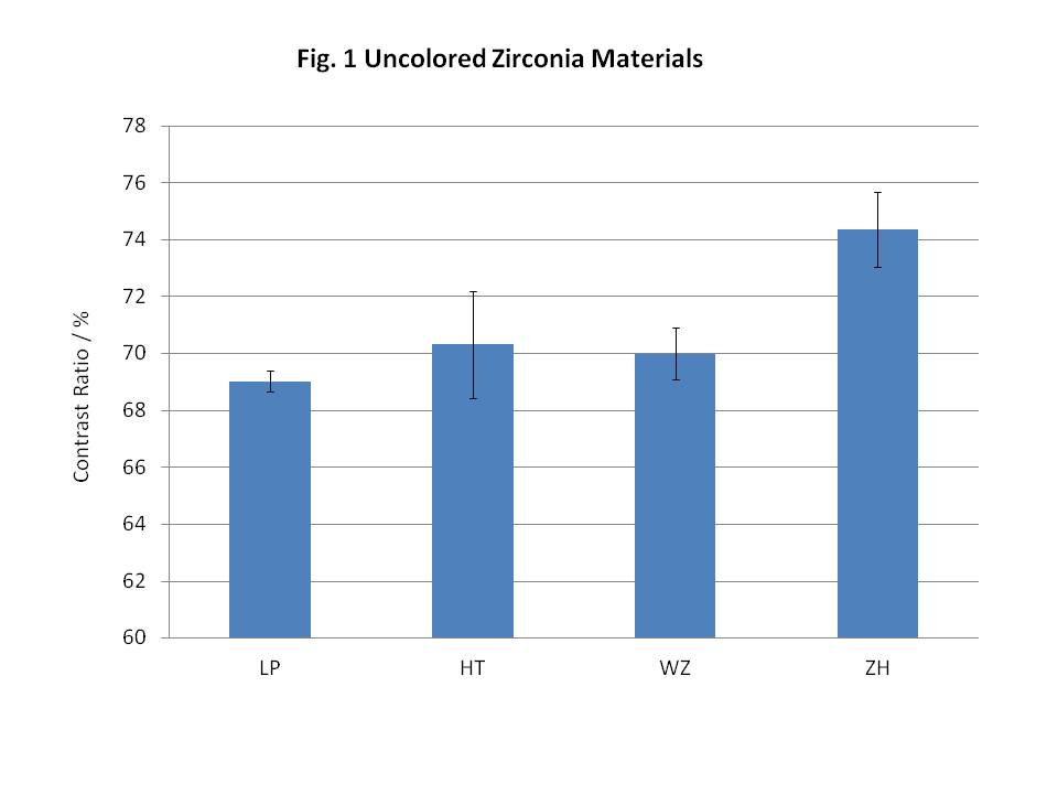 Methods: Fully sintered zirconia sample disks (thickness 1mm, diameter 14mm) were prepared according to manufacturer's instructions. N=5 for each group. Surfaces on both sides were finally polished with 3µm diamond suspension. Uncolored group: LP: Lava Plus zirconia (3M ESPE), HT: Crystal HT (Dental Laboratory Milling Supplies), WZ: Zenotec Bridge Translucent (Wieland), ZH: Translucent ICE (Zirkonzahn). Colored group: Zirconia materials as above with the following shading liquids: LPA3: Lava Plus A3 (3M ESPE), HTA3: Prettau A3 (Zirkonzahn), WZA3: Zr A3 (Wieland), ZHA3: Color Liquid A3 (Zirkonzahn). CR was recorded on a photospectrometer Color i7 (X-Rite Corp.). D65 lamp. Measuring mode: Remission contrast ratio. Aperture: 10mm. Specula: excluded. UV irradiation: on.