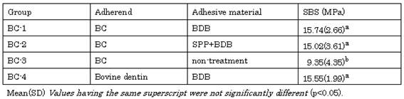 Results: BC-1 treated with BDB showed significantly higher SBS than untreated BC-3. BC-1 also exhibited high SBS, which is equivalent to that of BC-2 treated with combination of SPP and BDB, as well as that of BC-4 in which bovine dentin was treated with BDB.