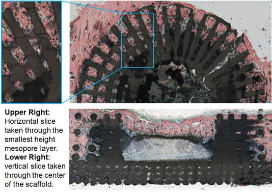 Conclusions: Bone density was higher in the more open, less scaffold-strut dense areas. Bone grew into all varied mesopore dimensions. This study demonstrates the properties of unique variable porosity bone repair scaffolds with varying densities that result in bone type ranging from cortical-like to trabecular. This information can be used to custom-design scaffolds for a wide range of complex bone defects.