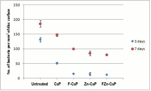 Results: The coated surfaces had compositional characteristics similar to that of bone mineral and they inhibited the growth, colonization and adherence of P.gingivalis, resulted in reduced thickness of biofilms and bacterial inhibition in the supernatant culture medium as compared to the positive and negative controls (statistically significant p<0.05). There was no significant difference between the experimental groups (p>0.05). All CaP coatings formed carbonate hydroxyapatite when immersed in SBF.