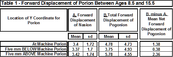 Problem statement: Over a number of years our laboratory has consistently tended to report the forward displacement of pogonion relative to superimposition on anterior cranial base to be smaller than that reported by other investigators. It has recently been posited that one reason for the difference may be the manner in which porion, the posterior point determining Frankfort line, is located. Method: We have recently conducted a graphical and numerical analytic test of this hypothesis using previously reported data on mandibular growth from a group of subjects with implants of the Bjork type (AJODO 102:134-42 102:227-38). For the same data set and the same superimposition on anterior cranial base (n = 20, age interval from 8.5 to 15.5 years), Frankfort plane was computed using three different positions for porion: 1) at machine porion, 2) 5 mm below machine porion, 3) 5 mm above machine porion. The location of orbitale was held constant in all cases. Results: Graphical and numerical analysis indicate that for constant location of orbitale, higher locations of porion will lead to the perception of a larger magnitude of forward movement of pogonion relative to the forward displacement of nasion. The larger the actual downward movement of pogonion, the larger this difference will become. Hence the disparity will be greater the longer the time interval between films in growing subjects. (See Table 1.) Conclusion: This experiment demonstrates the critical impact of differences in the orientation of the coordinate frame of reference upon inferences drawn from cephalometric data. Conclusions must be based on a firm understanding of local geometry.