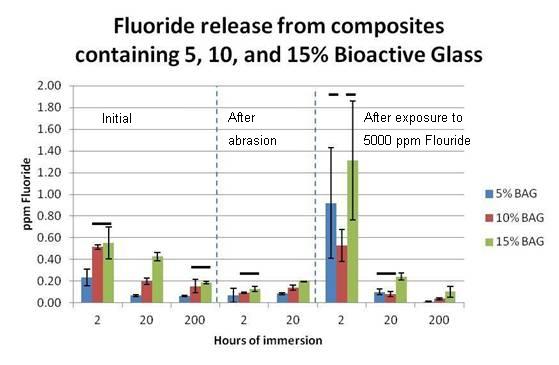 Results: Fluoride continued to be released (15% 10% > 5% BAG-composite) up to 222h of immersion (Figure; connected bars not significantly different). Abrasion did not increase fluoride release, but all composites showed significant increases in fluoride release after exposure to 5,000ppm F.