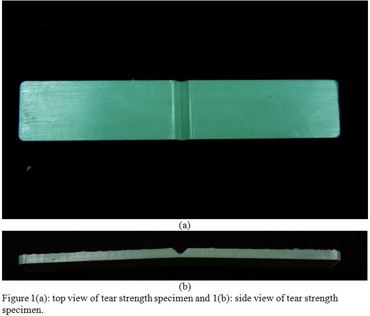 Methods: A v-notched tear strength mold with the following dimensions was used in this study 101.6mm longX19.05mm wide with v- notched region approximately 0.230mm-thick(SeeFig.1a-1b). Hand-spatulated specimens were placed in the mold (conditioned to 35°C) exactly one minute after start of mix. The specimens were then stored in a water bath at (35±1°C) for the manufacturer's-recommended time to leave in the mouth(minimum time to remove from mouth). Within 90sec of removal from the water bath (specimens were transported in a damp paper towel), the top and bottom 1-inch of the specimen was gripped in the Instron5582 equipped with pneumatic grips (17-20psi) and 240-grit abrasive paper. A tensile force was applied at a cross-head speed of 500mm/min until failure. A razor was used to slice three sections 1-mm wide from the notched region of the torn specimen. The thickness of each section was measured using a Nikon profile projector. The average thickness (ha) of the notch cross-section was used to calculate tear strength, Ts(MPa) using the following equation: