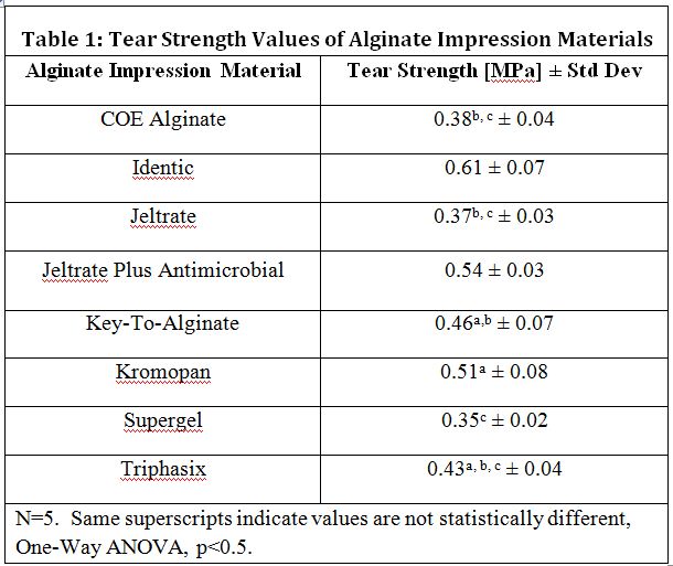 Conclusion: A test method using an axial-notched mold was successfully employed to determine tear strength values of various alginate impression materials and report statistically significant differences.