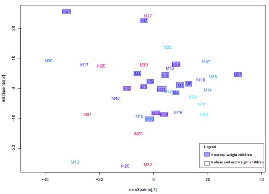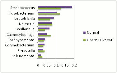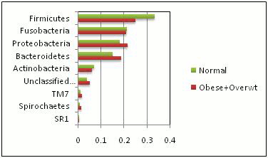 Results: Over 90% of the sequences from the normal and obese groups belonged to five bacterial phyla: Firmicutes, Fusobacteria, Proteobacteria, Bacteroidetes, and Actinobacteria. However, an assessment for differential abundance in the two groups identified several interesting taxonomic groups that showed statistically significant differences in their abundances (p<0.05). They include Firmicutes and Spirochaetes at the phylum level (Figure-1), as well as Streptococcus and Treponema at the genus level (Figure-2). In multidimensional scaling (MDS) scatter plots, results for the normal group appeared to cluster while those of the obese group widely dispersed, indicating a relatively more stable bacterial population in the normal group (Figure-3).