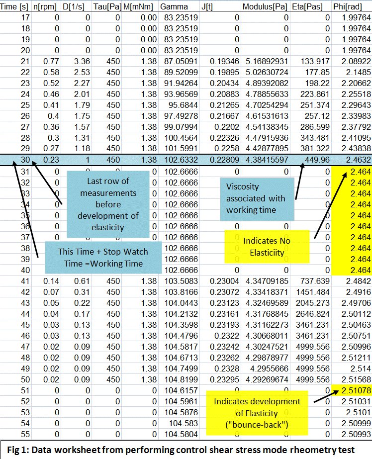 Methods: A Brookfield-Model-R/SR-CPSTP1-Plus-Cone/Plate-Rheometer with Peltier-temperature-control-system was used in Control-Shear-Stress-mode. Brookfield-Rheo-2000-Software-program was used to apply a constant-shear-stress(Tau) of 450Pa (determined from pilot-testing) to the elastomeric-impression-material for 10seconds and then unload for 10seconds. This cyclic-loading and unloading was repeated for a pre-determined time-period (typically, 3minutes). Tests were performed using a-plate-and-plate test-configuration (25mmDiameter-plate with 0.3mm-gap between bottom-stationary-plate and upper-rotating-plate). Temperature of rheometer-plate was 23±0.1°C or 35±0.1°C. Pilot-testing was performed on each elastomeric-impression-material to determine how many seconds after start of mixing to start rheometer-program. A starting shear-rate less than 10reciprocal-seconds was the goal for when to start the program (this minimized effects of high shear-rates during setting on properties). The software-program recorded several variables with respect-to-time (one-data-point-per-second). Critical variables include: shear-rate(D),shear-stress(Tau),viscosity,rpm-of-spindle, distance-spindle-rotates(Phi,radians), strain(Gamma), modulus(Tau/Gamma), torque, creep(J). During a test, when the material begins to develop elasticity, the top-plate will rebound (“bounce-back”) to a measurable degree during un-loading (constant-shear-stress released). The time at the end of the previous-cycle (before-rebound-indicated) plus the amount of time from start-of-mixing to start of rheometer-program (monitored with stop-watch) is the working-time (Fig.1 illustrates data-analysis).