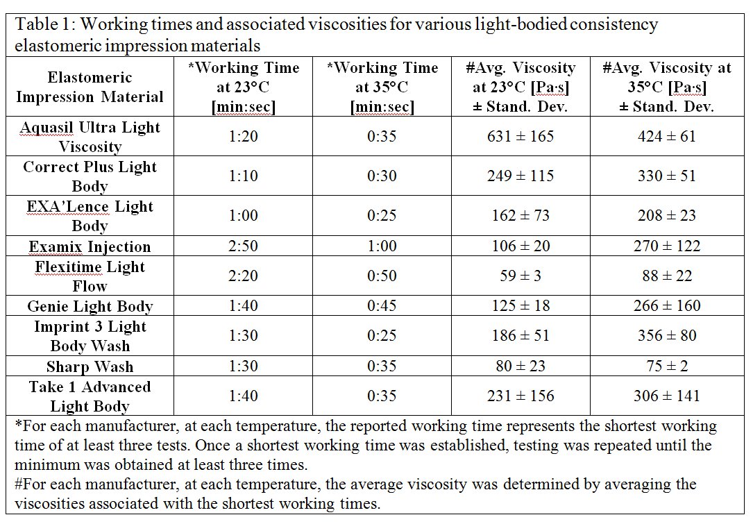 Conclusions: A method for simultaneous determination of working-times and rheological-properties of elastomeric-impression-materials is reported along with the results of using this method to determine working-times and associated-viscosities for different light-bodied-consistency elastomeric-impression-materials.