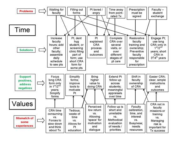 Conclusions: Attempts have been made to incorporate the CRA system closer to the restorative care planning and delivery, with partial success. This helps achieve a strategically planned, comprehensive adoption of the CRA program in IUSD. The findings of the focus groups' analyses are summarized as a hierarchy of values, a system of concepts, and discrete points of intervention to increase ownership of the CRA throughout IUSD. Future studies based on hypotheses generated by this research will also provide an opportunity to test the transferability of findings.