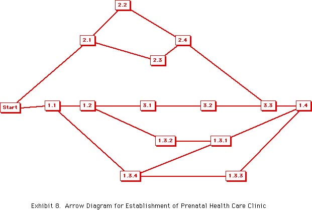 The linkages among various activities to be undertaken in a pre-natal health care clinic project are shown in Exhibit 6. Activity descriptions, linkages, and estimated durations for these activities are shown in Exhibit 7.