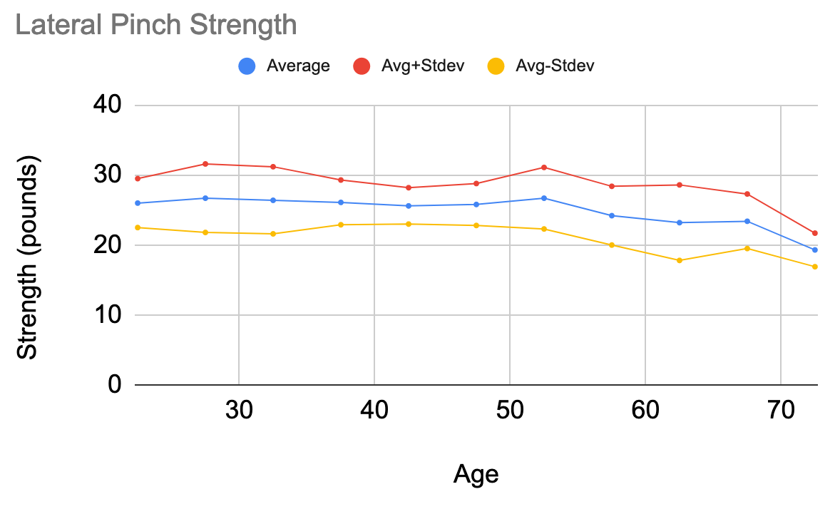 Adapted from: Mathiowetz V, et al. 1985. Grip and pinch strength: normative data for adults. Arch Phys Med Rehabil, 66(2), 69-74.