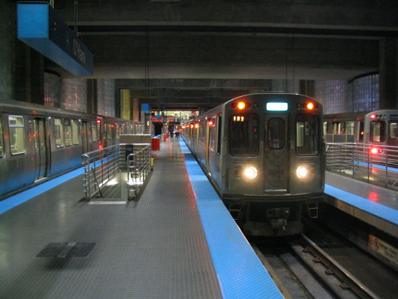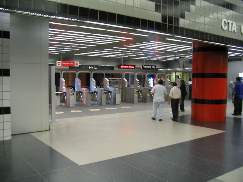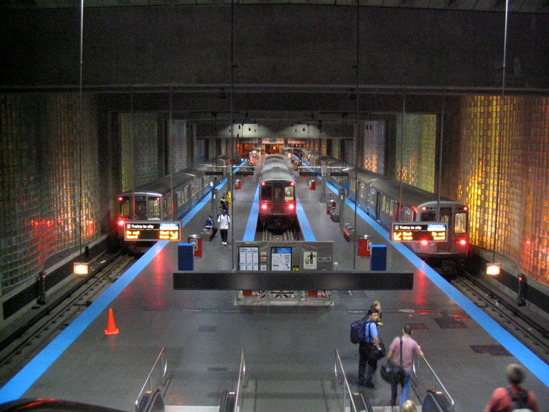 Мы выходим из самолета и следуем длинными корридорами огромадного терминала (да, конечно же с травалаторами) в направлении указателей Trains to city и наконец попадаем в большой пешеходный туннель связывающий три местных терминала друг с другом и со станцией метро. В самой середине этого туннеля расположен вход в метро. Турникеты с "вертушками", широкие, для прохода с любым разумным багажом. И на вход, и на выход, только на одно направление. Мы покупаем магнитную карточку (только на себя, багаж бесплатно) и проходим через турникеты. И тут нам открывается вид на саму станцию. Станция трехпутная, двухплатформенная, на данный момент конечная Синей линии. Два крайние пути имеют заделы на продление линии дальше на запад под полем аэропорта, и это продление возможно будет реализовано после строительства нового западного терминала, о котором уже довольно давно идут разговоры. Средний путь тупиковый. Световые указатели показывают путь с которого отправится следующий поезд (на данной фотографии это центральный путь, на него указывают большие стрелки на обоих указателях). Текст на указателях (немного размыт на снимке) либо Next train со стрелкой, либо Do not board. Платформы связаны с верхним распределительным уровнем двумя эскалаторами и лестницей (окончания эскалаторов видны на снимке). На станции вывешено расписание на все поезда по всем дням недели (левая панель из трех в начале тупикового пути). В то время как в середине рабочего дня интервалы составляют 6 минут и расписание может показаться ненужным, оно совсем нелишне в середине ночи (скажем в районе 3 часов), когда поезда отправляются раз в 30 минут (синяя линяя - одна из двух круглосуточных). На станции видны три поезда, два правых из достаточно современных вагонов, крайний левый из вагонов самой старой серии, которых осталось всего 120 штук и которые ходят только на этой линии. У этих старых вагонов, в отличие от всех остальных, двери "гармошкой", а не раздвижными половинками. Также видна и разная составность: два левых - четырехвагонные, правый - шестивагонный (или даже восьмивагонный). Станция на самом деле не совсем подземная, а скорее просто углубленная, над ней построен многоэтажный гараж для машин.