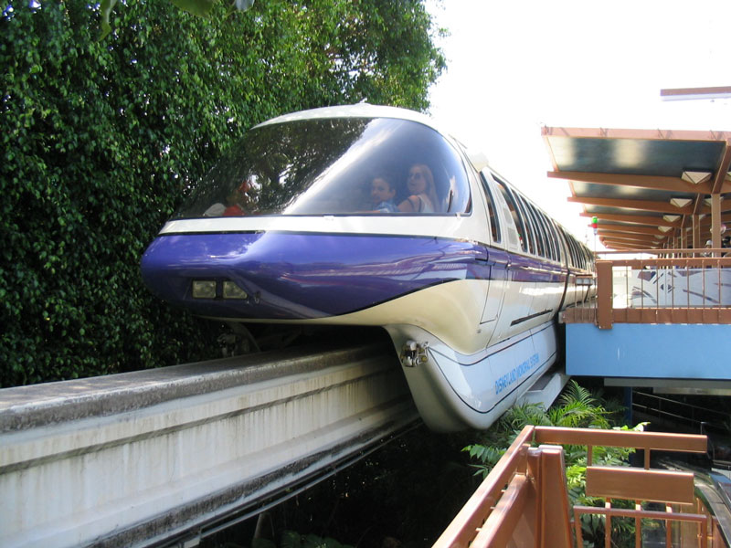 Монорельс был открыт в 1959 году, на четыре года позже самого тематического парка, названного Диснеем "самым счастливым местом на Земле". После примерно сорока лет работы, он был полностью реконструирован, и сейчас это практически новодел, но с прежним внешним видом. У монорельса всего две "станции" -- одна в самом парке, в "земле будущего" (так называется одна из частей парка), другая возле гостничного комплекса. По сути он выполняет роль и аттракциона, и автобуса-челнока от гостиниц в парк и обратно. Для того, чтобы пройти на посадку из гостиниц, нужно иметь билет в парк (из парка, естественно, билет не нужен). Поезда носятся очень быстро, я в сумме попытался сделать около десятка кадров, но практически всегда просто не успевал, и для того, чтобы получить кадры ниже, приходилось просто стоять с включенным и сфокусированным фотоаппаратом и ждать момента "пролета" поезда. Ускорения достаточно плавные, и в целом, сделав на нем полный круг, я остался вполне доволен сим аттракционом :-)