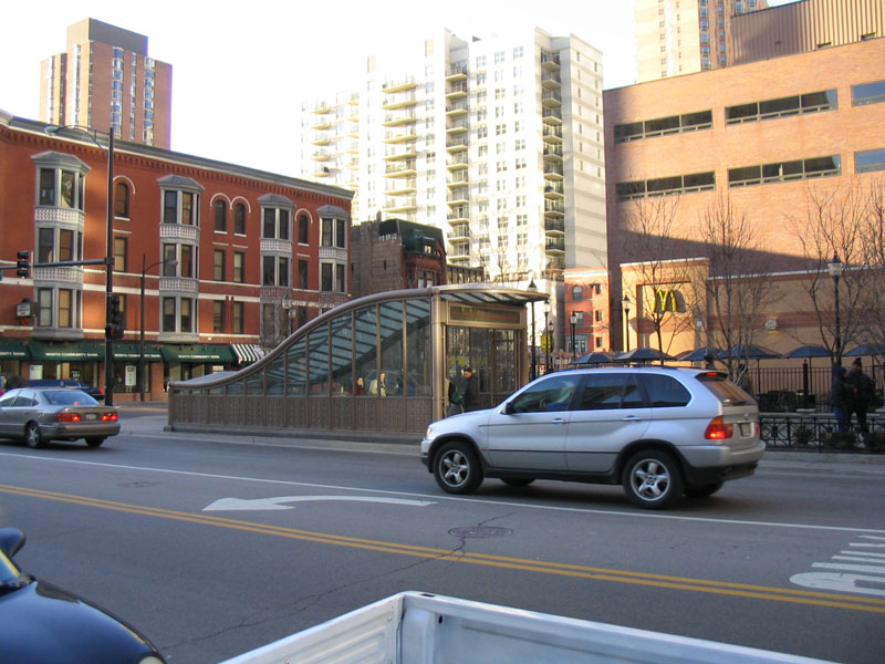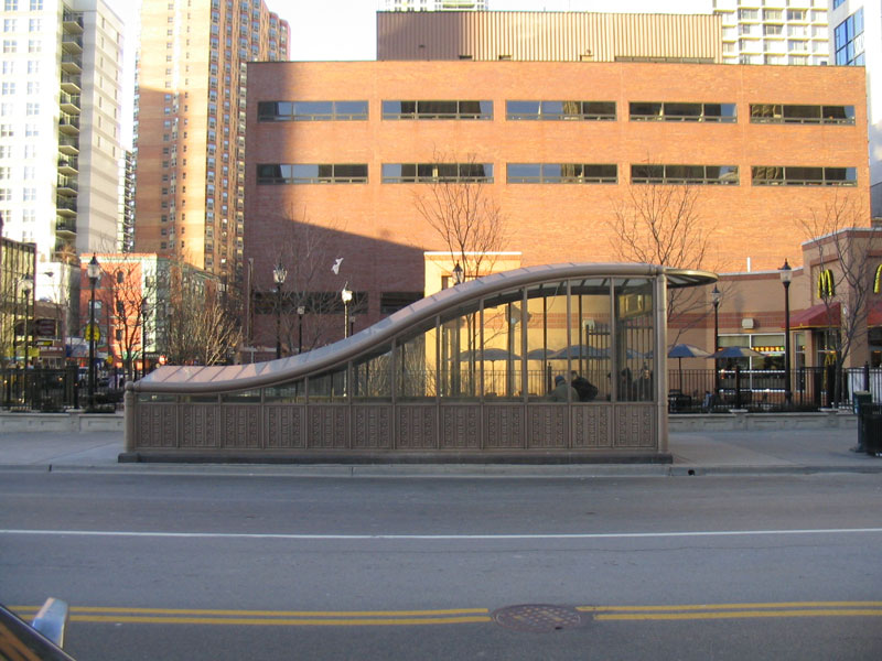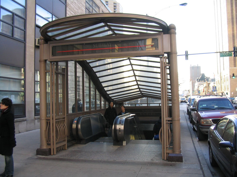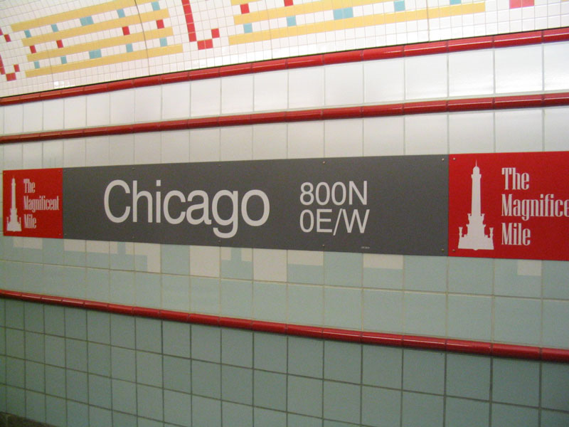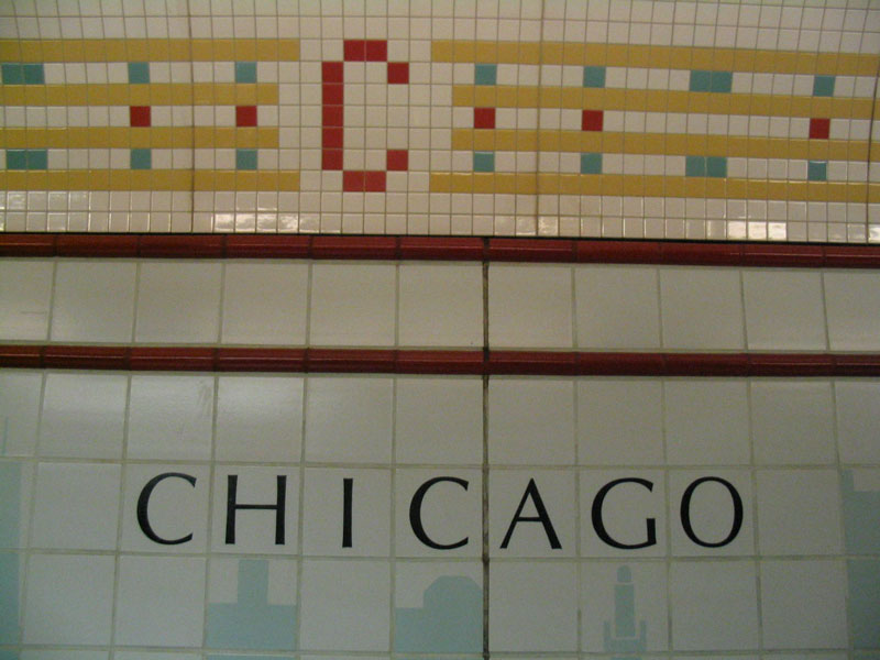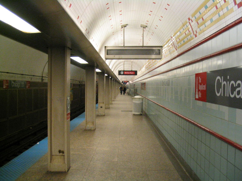 Я уже описывал одну из типичных подземных станций чикагского метро (хотя и самую длинную в городе) вот здесь. Эта станция - с островной платформой. Здесь же я хочу привести маленький фотоотчет о другой типичной подземной станции, но уже с боковыми платформами. Как и Jackson, эта станция красной линии была реконструирована сравнительно недавно и хорошо отражает тенденцию в оформлении всех подземных станций метро. Отдельная особенность этой станции состоит в ее названии - "Чикаго", - которое было присвоено не по имени города, а по названию одной из авеню. Надо отметить, что объявление диктором в вагоне "This is Chicago" неизменно вызывает улыбки туристов, которые в принципе не сомневаются, в каком они сейчас городе :-) Особенную же радость вызывает следующая буквально через несколько остановок станция "Калифорния" (опять же поименованная по названию улицы).