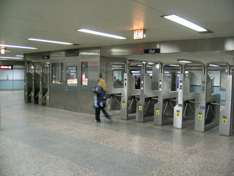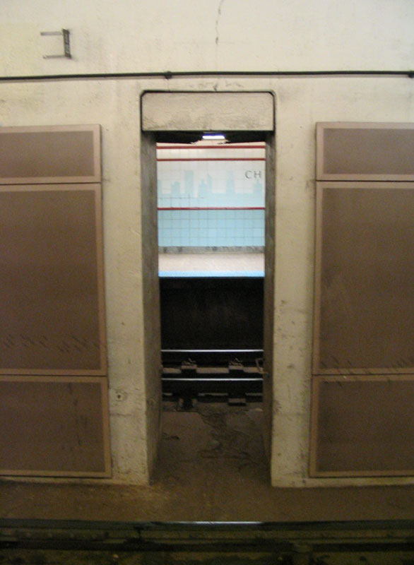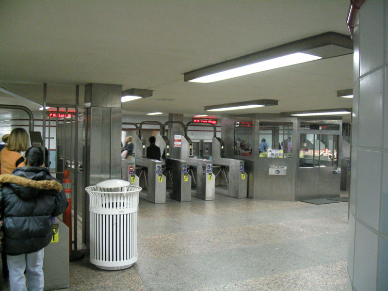 Итак, мы подходим по Чикаго авеню к станции. Один из входов: так и сяк. Более близкое рассмотрение обнаруживает наличие эскалатора на подъем и лестницы на спуск. Спускаемся, проходим к турникетам. Снимаем со стороны неоплаченной зоны, проходим турникеты и делаем еще один кадр уже из оплаченной зоны. На обоих фотографиях видна одна из особенностей, которую я, как заядлый любитель карт, особо ценю в американских метрополитенах: на первой видны бесплатные карты всего чикагского транспорта на будке контролера (выходящие один-два раза в год), а на второй подобная же карта виднеется и на стене. На последней также видны автоматы по продаже билетов (которые я уже фотографировал вблизи, но на другой станции).