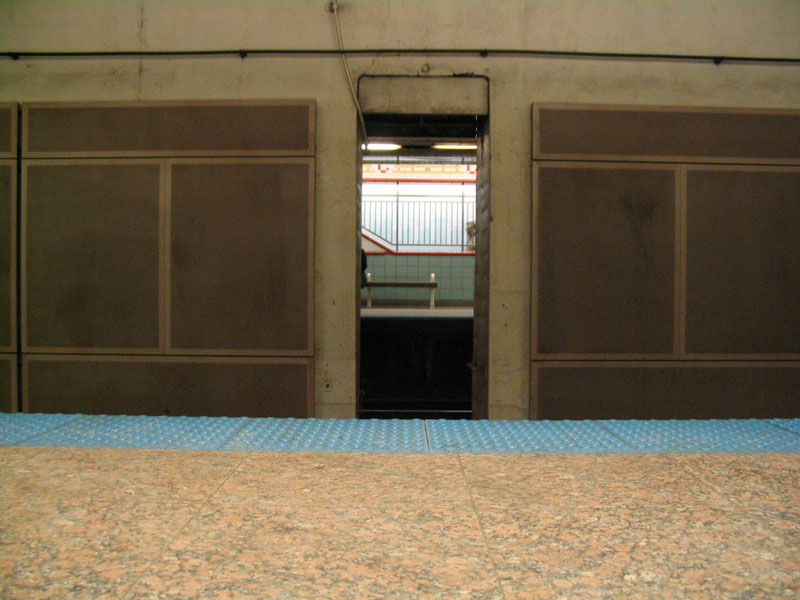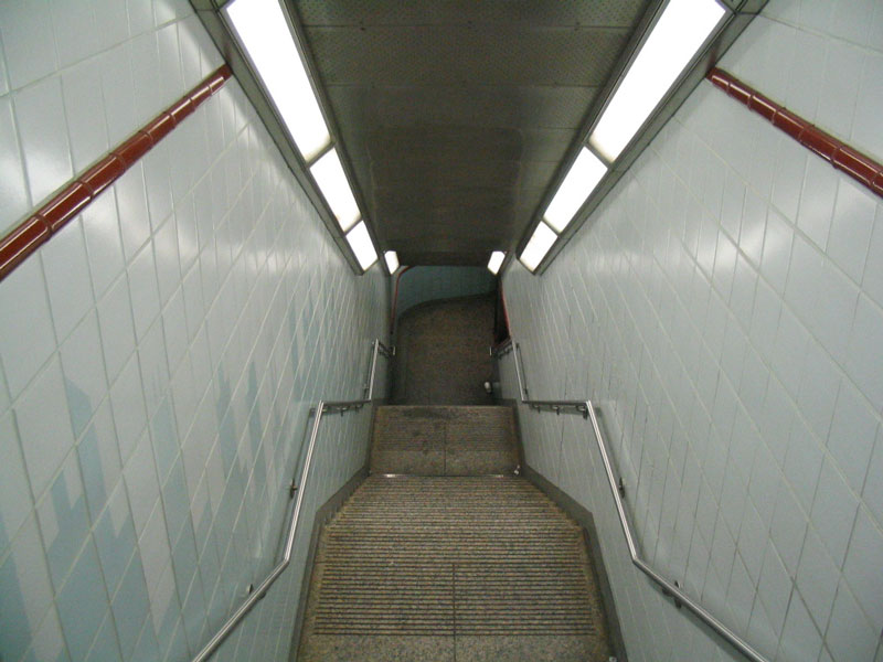 Спускаемся по одной из нескольких довольно узких лестниц на одну из двух платформ. Общие виды платформ: одной (с лестницей, по которой мы только что спустились) и другой - с эскалатором, работающим опять же только на подъем, и в противоположную сторону. Пути (и соответственно боковые платформы) разделены стеной, на которую опирается каждый из двух основных сводов. Но стены не сплошные, в них есть проемы, через которые видна другая платформа. Сделано это вроде бы для безопасности - как рабочих при работах на путях, так и пассажиров, особенно когда платформы пустынны в ночное время (эта линия работает круглосуточно).